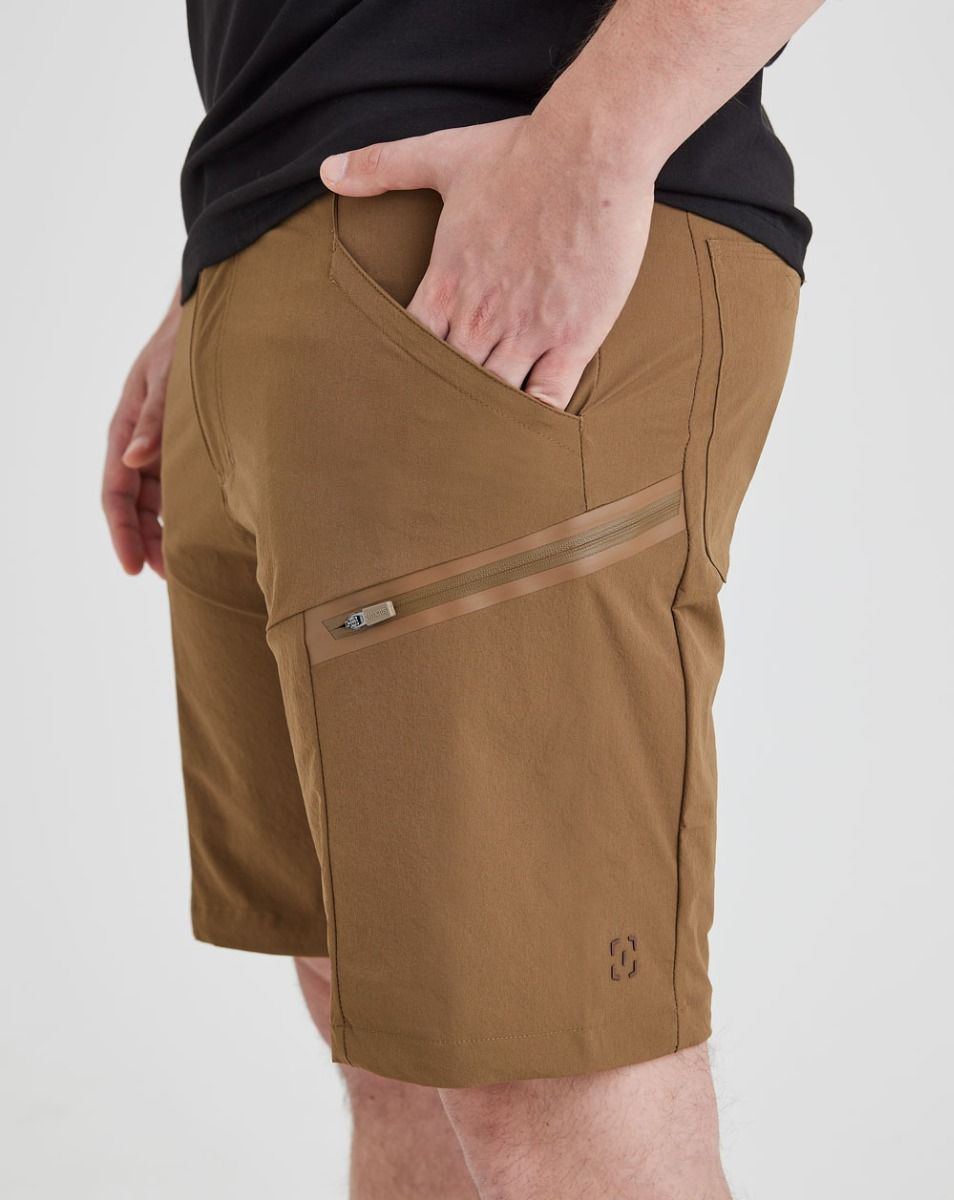 7 bolsos multifuncionais, sendo: 2 bolsos frontais, 2 bolsos laterais com acabamentos selados, 1 bolso porta-celular e 2 bolsos traseiros com fechamento em tecido aderente.